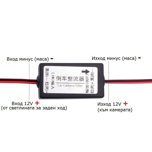 Филтърът се монтира на захранващата линия на камерата за заден ход.