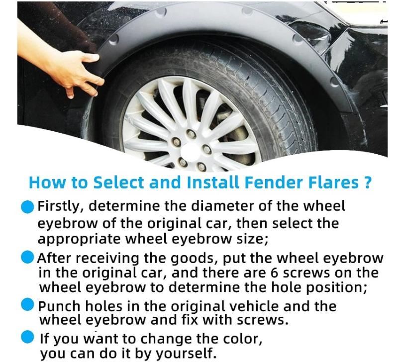 За да монтирате разширителите ще пробиете дупки в калниците си. Този комплект разширители е универсален, тоест не е за конкретна марка и модел автомобил. При монтажа е възможно да се наложи да бъдат леко подрязани, или нагряти с пистолет за горещ въздух, за да се получи перфектната форма.
