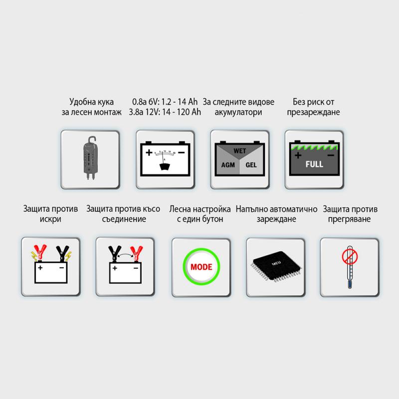 Ток на включване : < 50 A Номинален входящ ток : максимум 0,6 A ( ефективна стойност ) Ток за зареждане : максимално 7A Консумирана мощност : 60 W ПРЕДИМСТВА НА ПРОДУКТА Изключително подходящ за зареждане на акумулатори на леки автомобили, лодки, селскостопански машини и др. ( 12V / 24V ) Скоба за удобен захват Без риск от презареждане на акумулаторната батерия Защита против възпроизвеждане на искри Пълна защита срещу късо съединение и обръщане на поляритета Лесна и бърза настройка само с един бутон Светлинна индикация за нивото на зареждане Напълно автоматизирано зареждане Защита против прегряване Функция за запаметяване IP65 водоустойчивост и защита срещу попадане на прах в корпуса ПРЕДУПРЕЖДЕНИЕ ЗА ПОЛЗВАНЕ Препоръчително е да се съхранява на подходящо място, недостъпно за деца. Свържете се с наш сътрудник, ако не сте сигурни, че продукта е съвместим с акумулатора на вашия автомобил. ДОПЪЛНИТЕЛНА ИНФОРМАЦИЯ Качествен продукт от : BOSCH ( Германия ) Гаранция 2 години от датата на закупуване На всички водачи на моторни превозни средства пожелаваме лек път и хиляди безаварийни километри.